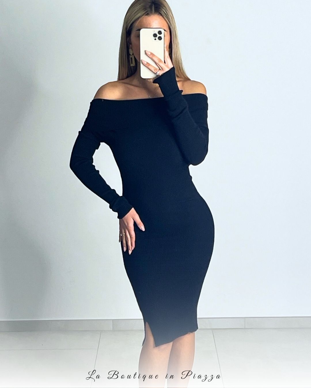 Abito longuette con spalla scoperta e piccolo spacco laterale che slancia la figura. Semplice ma d’effetto.
