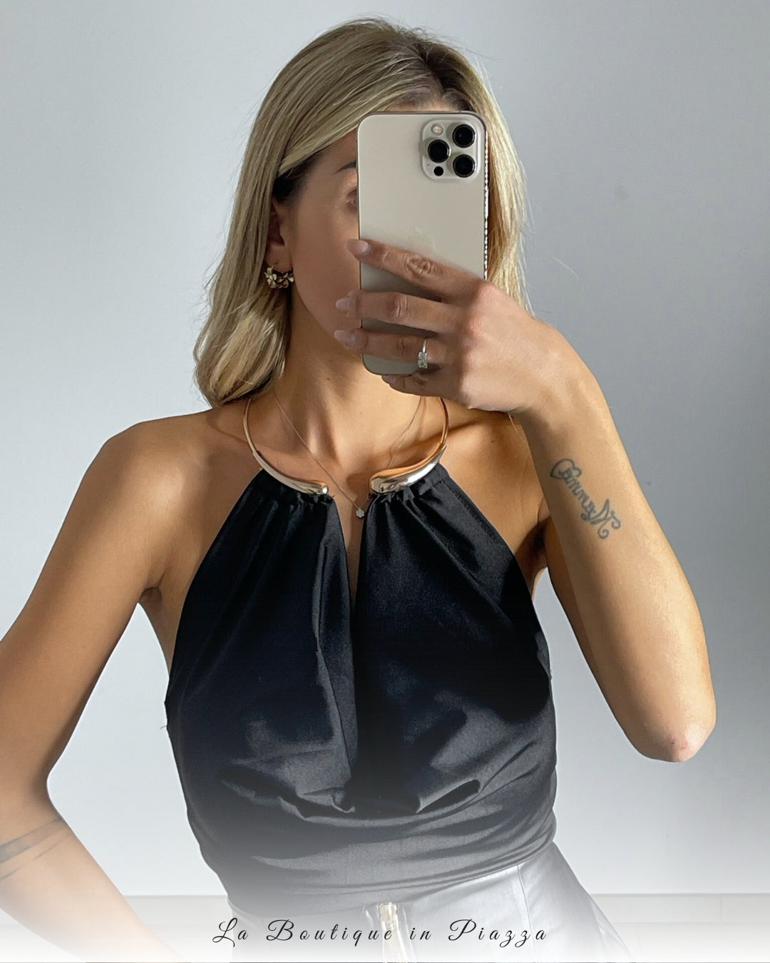 Tessuto lucido, dettaglio gioiello e schiena scoperta per un look sensuale e sofisticato.