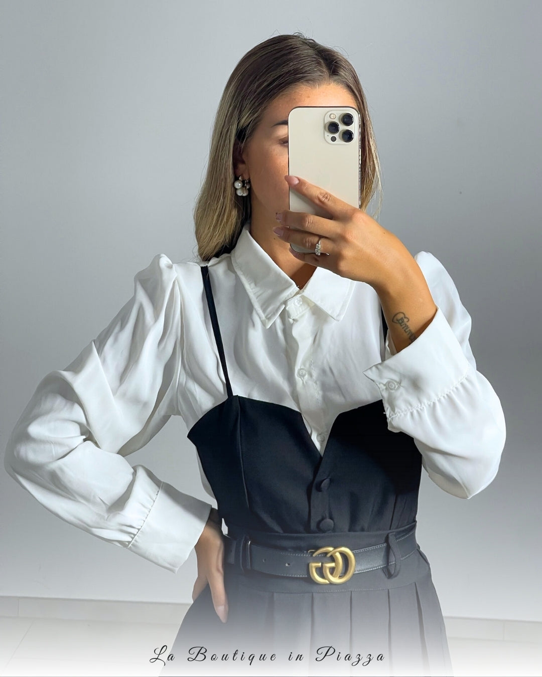 Un pezzo originale e super fashion: camicia con maniche morbide e colletto, abbinata a corpetto stile gilet con bottoncini e spalline sottili a contrasto.