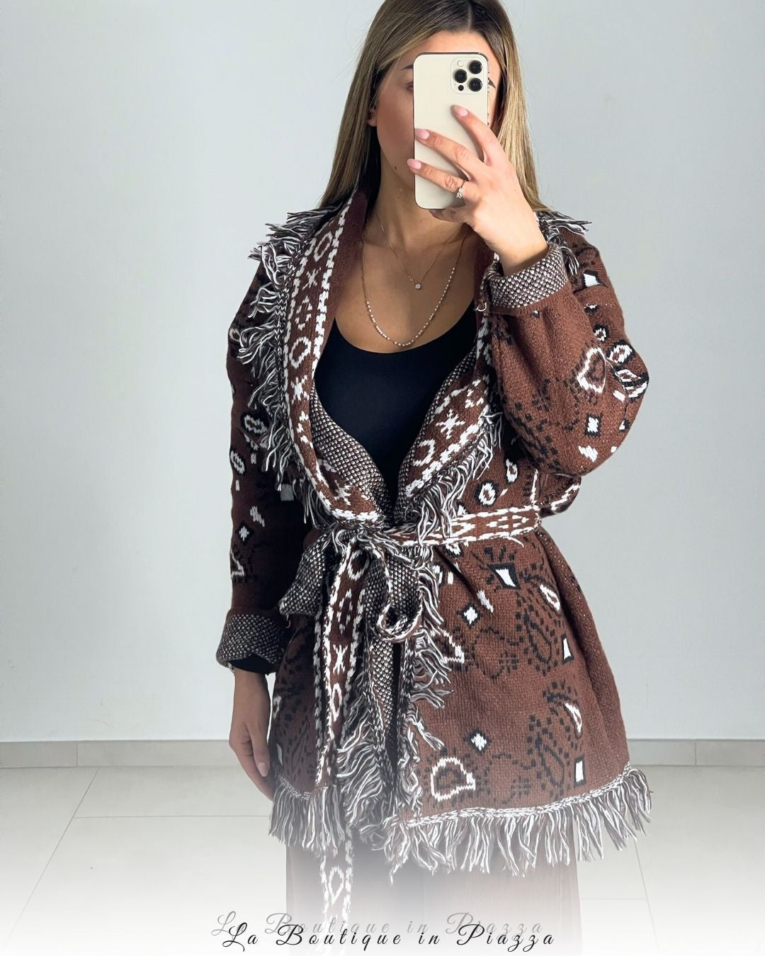 Cardigan jacquard con frange, cintura a fiocco e vestibilità unica.