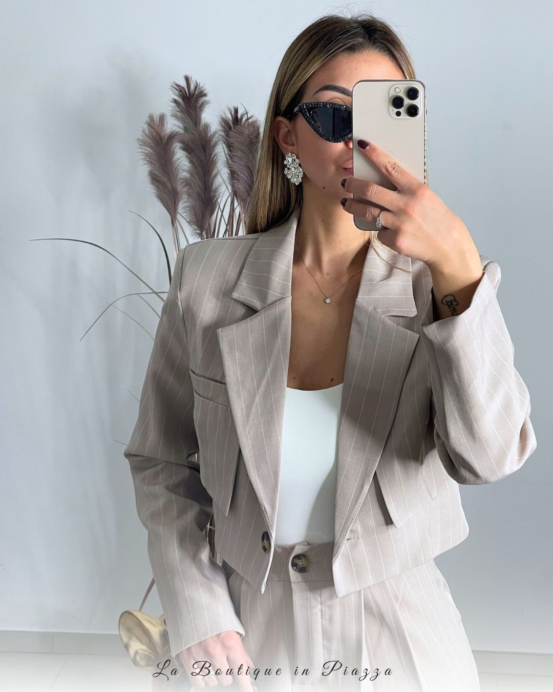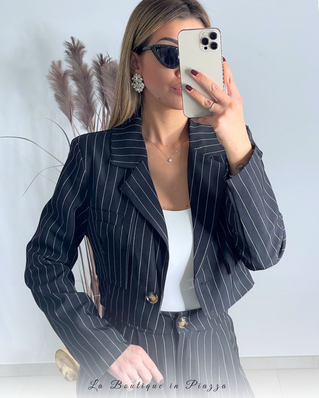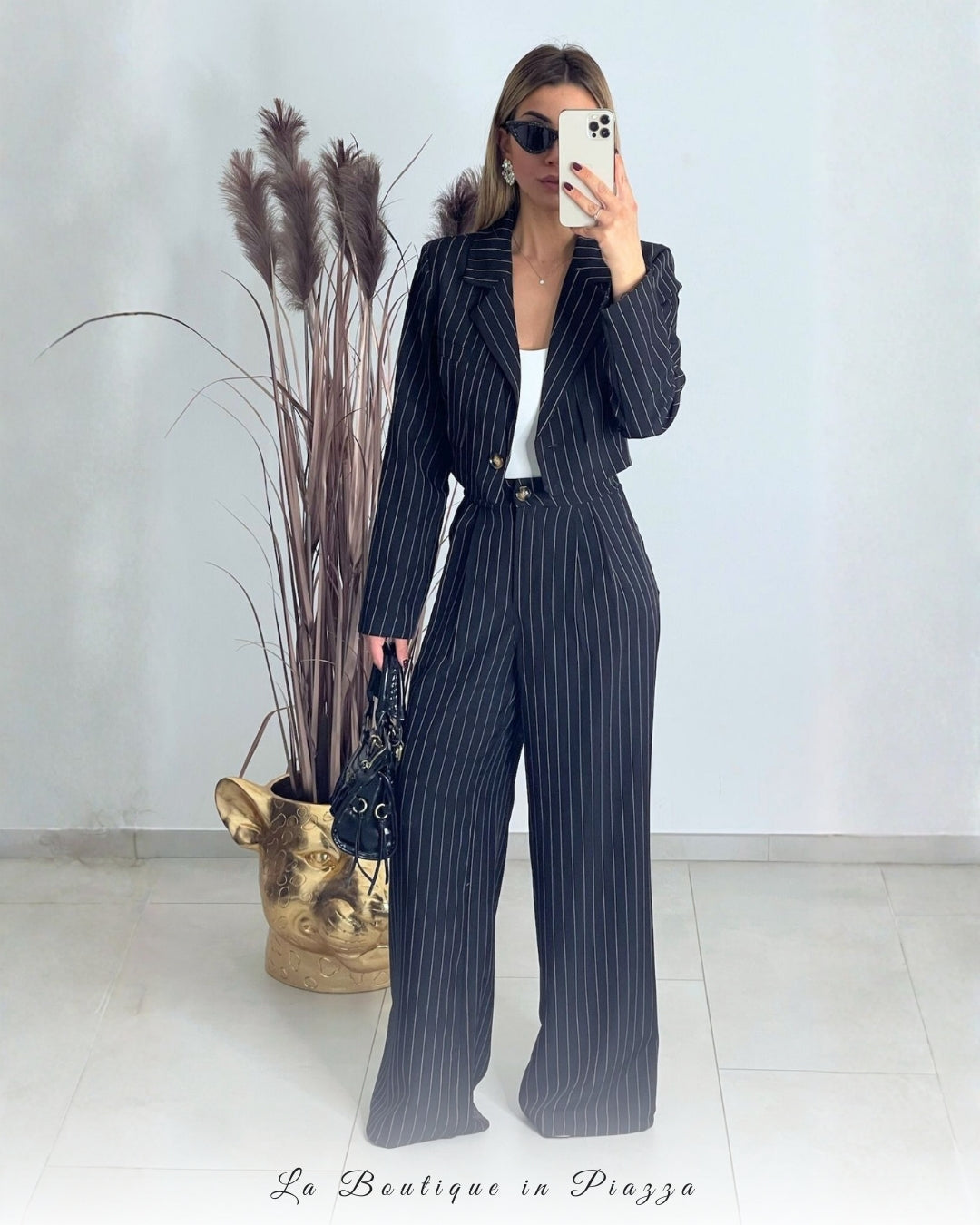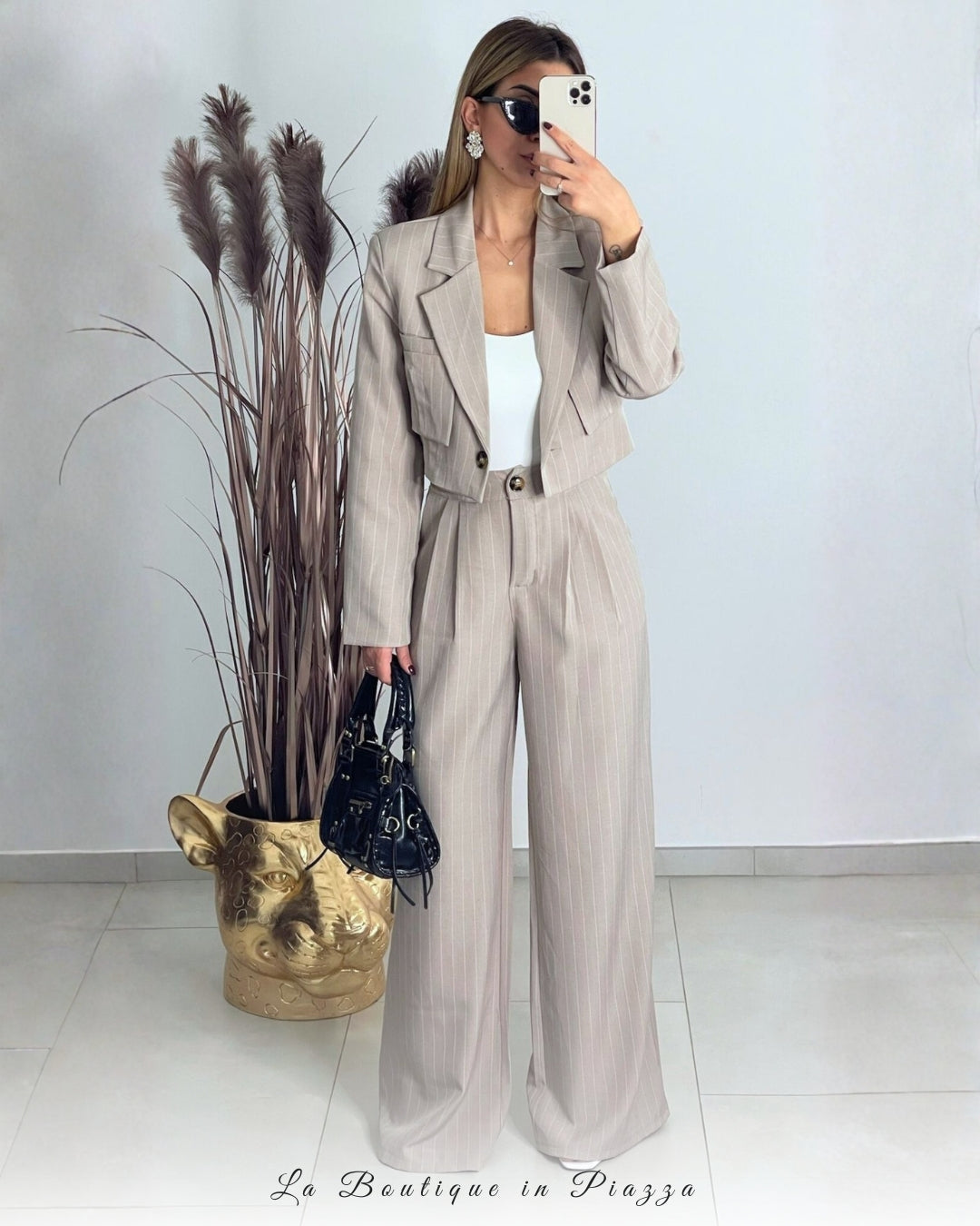 Completo gessato con pantalone a palazzo e giacchetta crop.