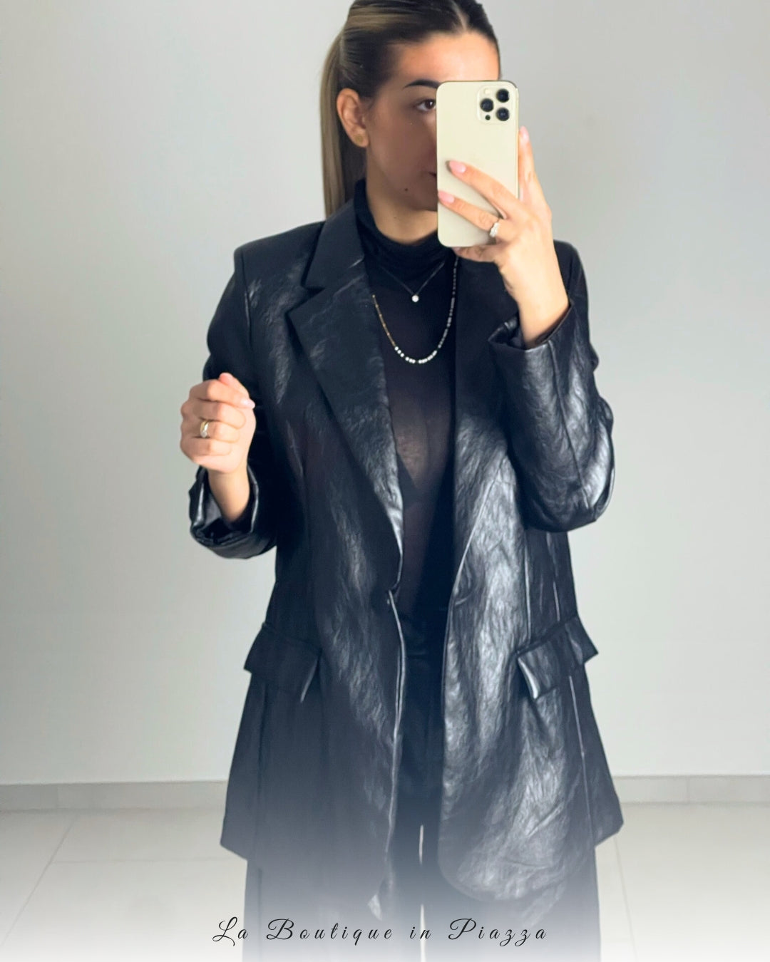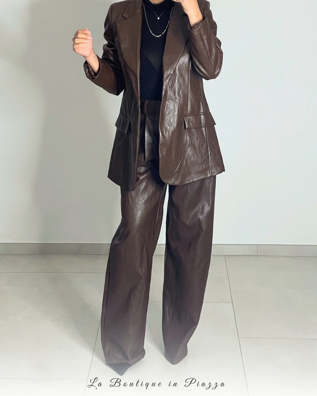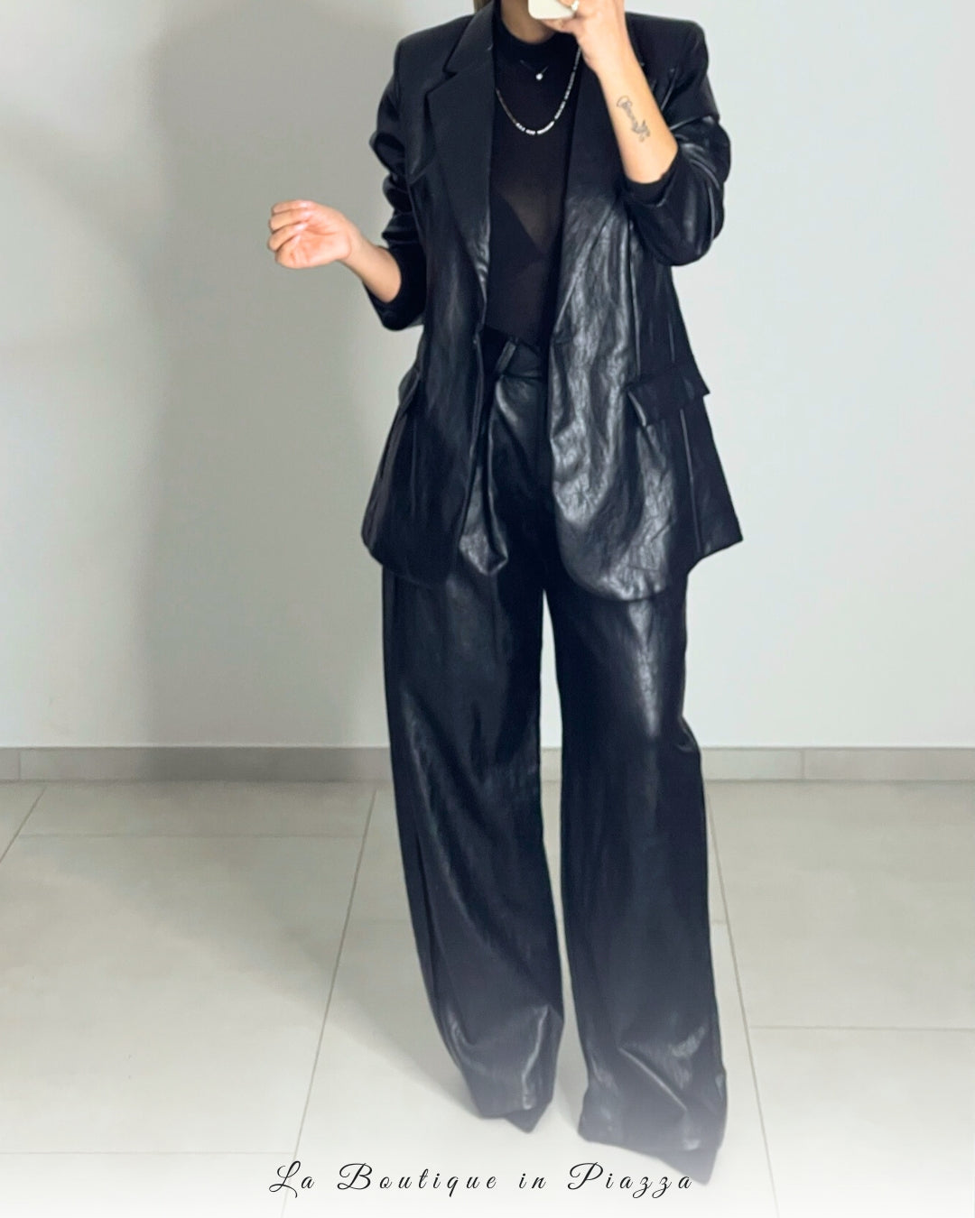 Completo in ecopelle con giacca leggermente over e pantalone palazzo.
