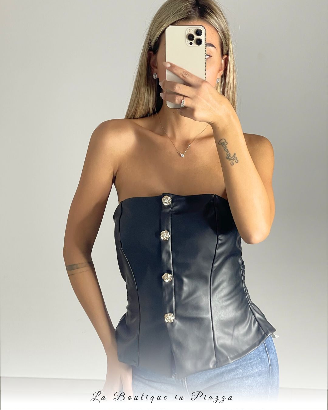 Senza spalline e con taglio che segue i fianchi, il Corpetto Rock in ecopelle è il dettaglio perfetto per le tue serate più grintose. Femminile, deciso e irresistibile.