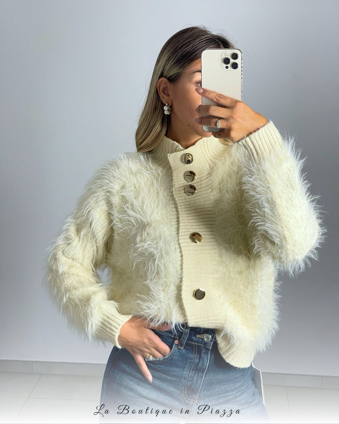 Divertente e calda, la felpa Orso è arricchita da bottoncini, dettagli in maglia e inserti in pelo.