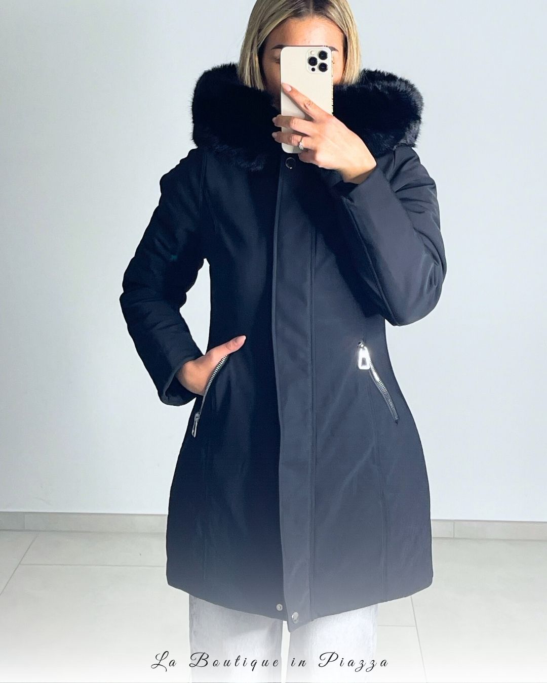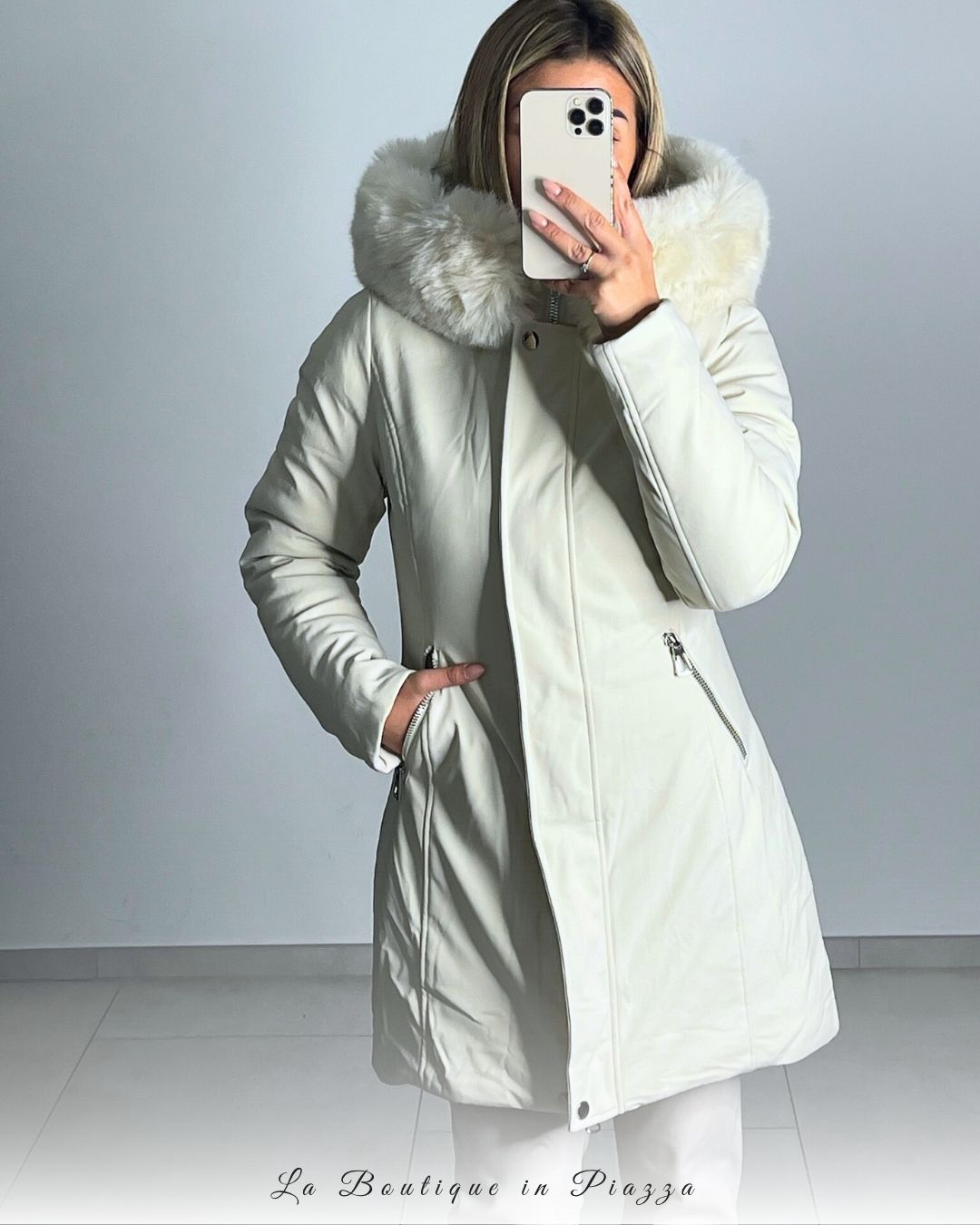 Giubbotto impermeabile con eco-pelliccia e linea elegante. Perfetto per il freddo e la pioggia.