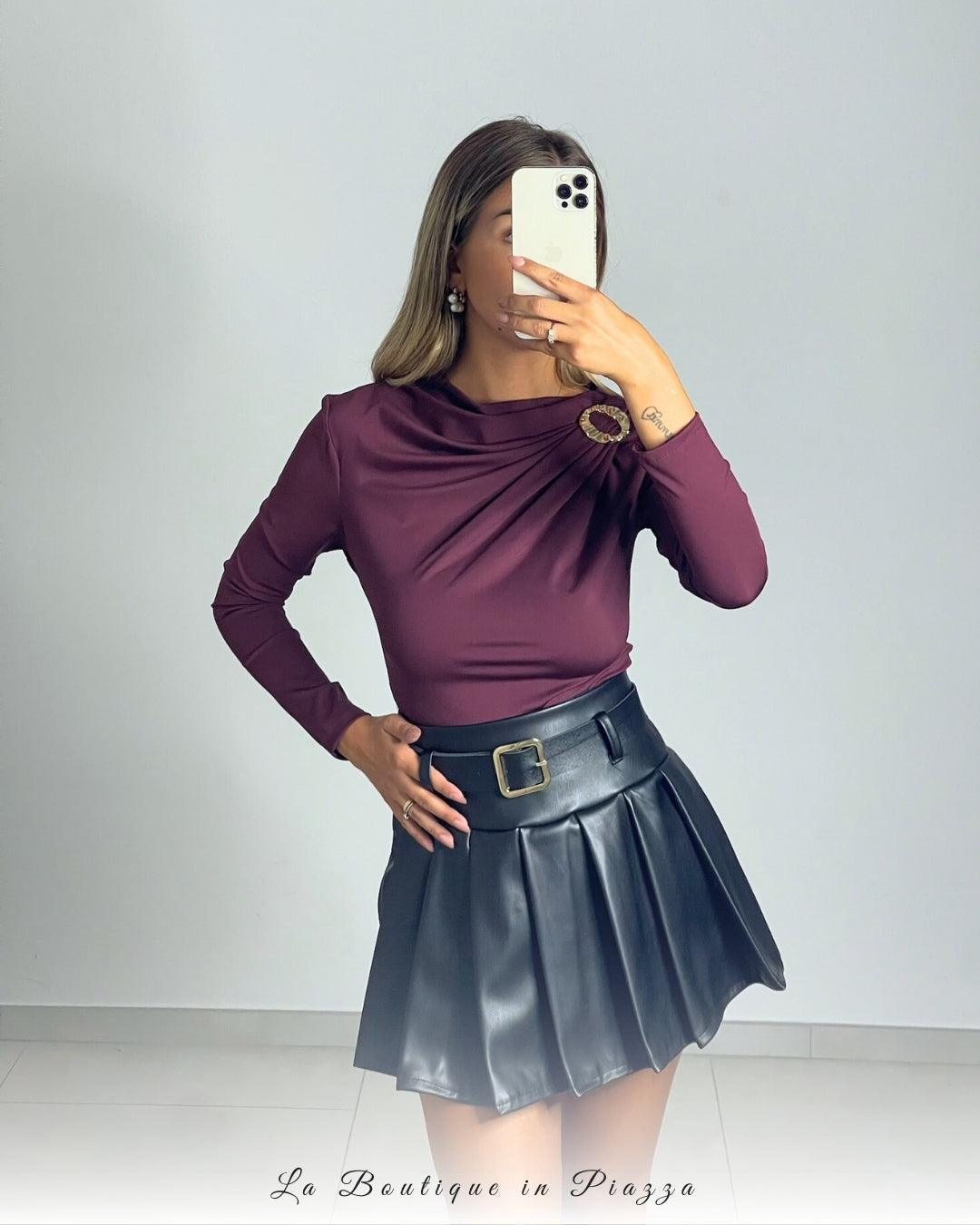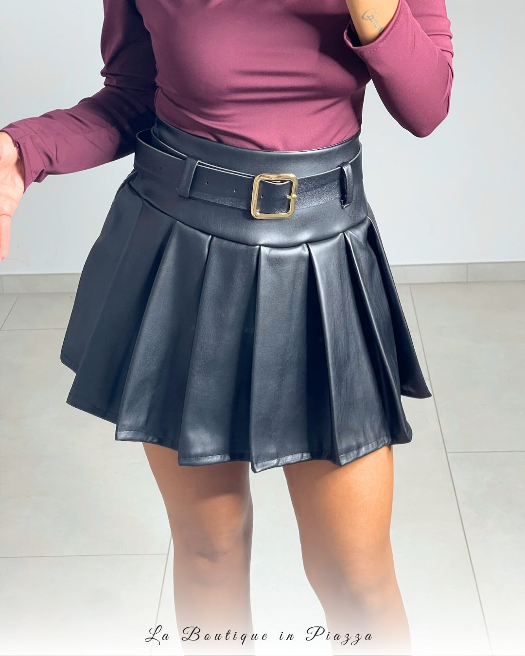 Un mix di grinta e femminilità: la gonna School in ecopelle con pieghe e cintura è un capo trendy e giovanile.