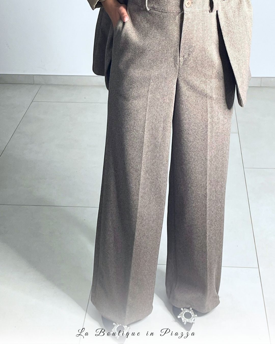 Pantalone a palazzo caldo e strutturato, con fantasia spigata che dona eleganza immediata. Perfetto per creare look coordinati con la giacca Gold.