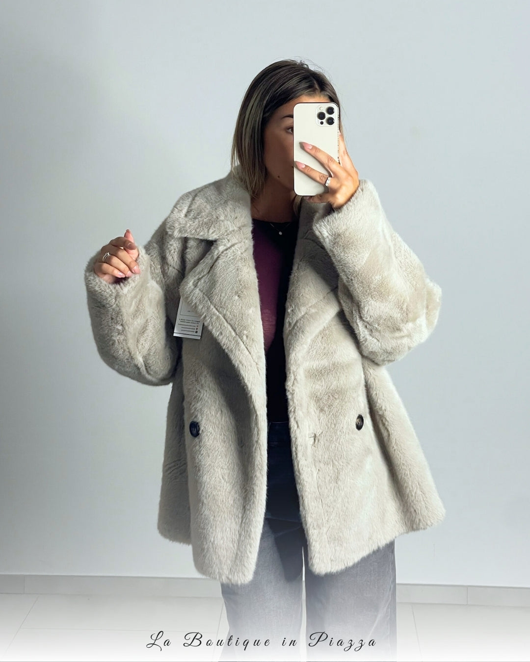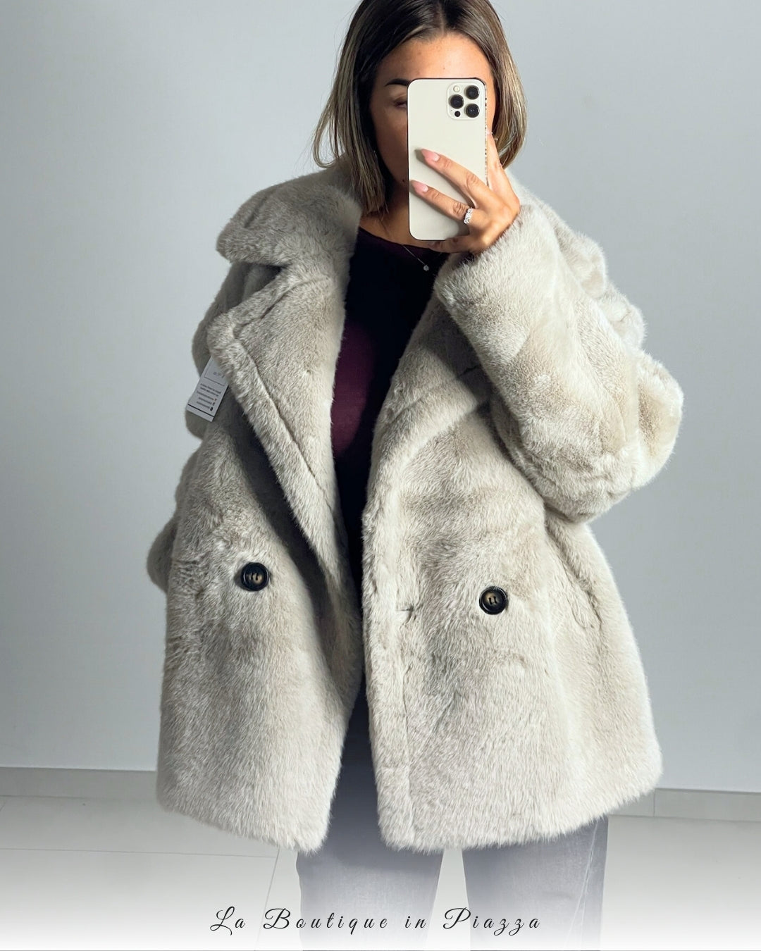 Morbidissima e strutturata, la pelliccia Teddy è rifinita nei minimi dettagli per un effetto elegante ma cozy.