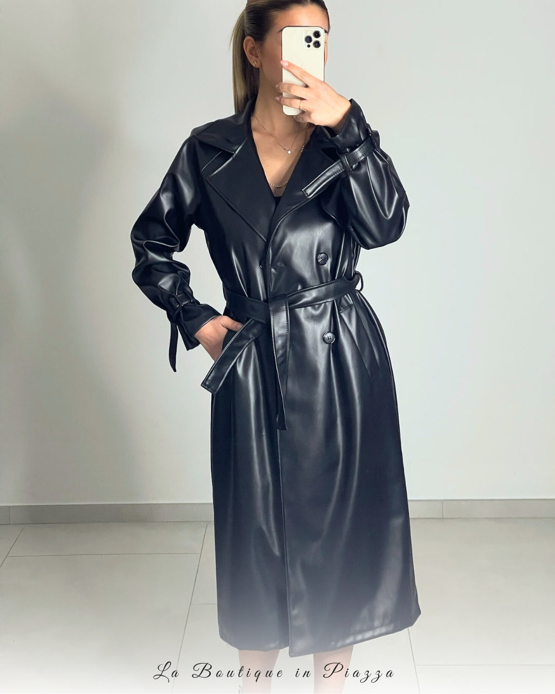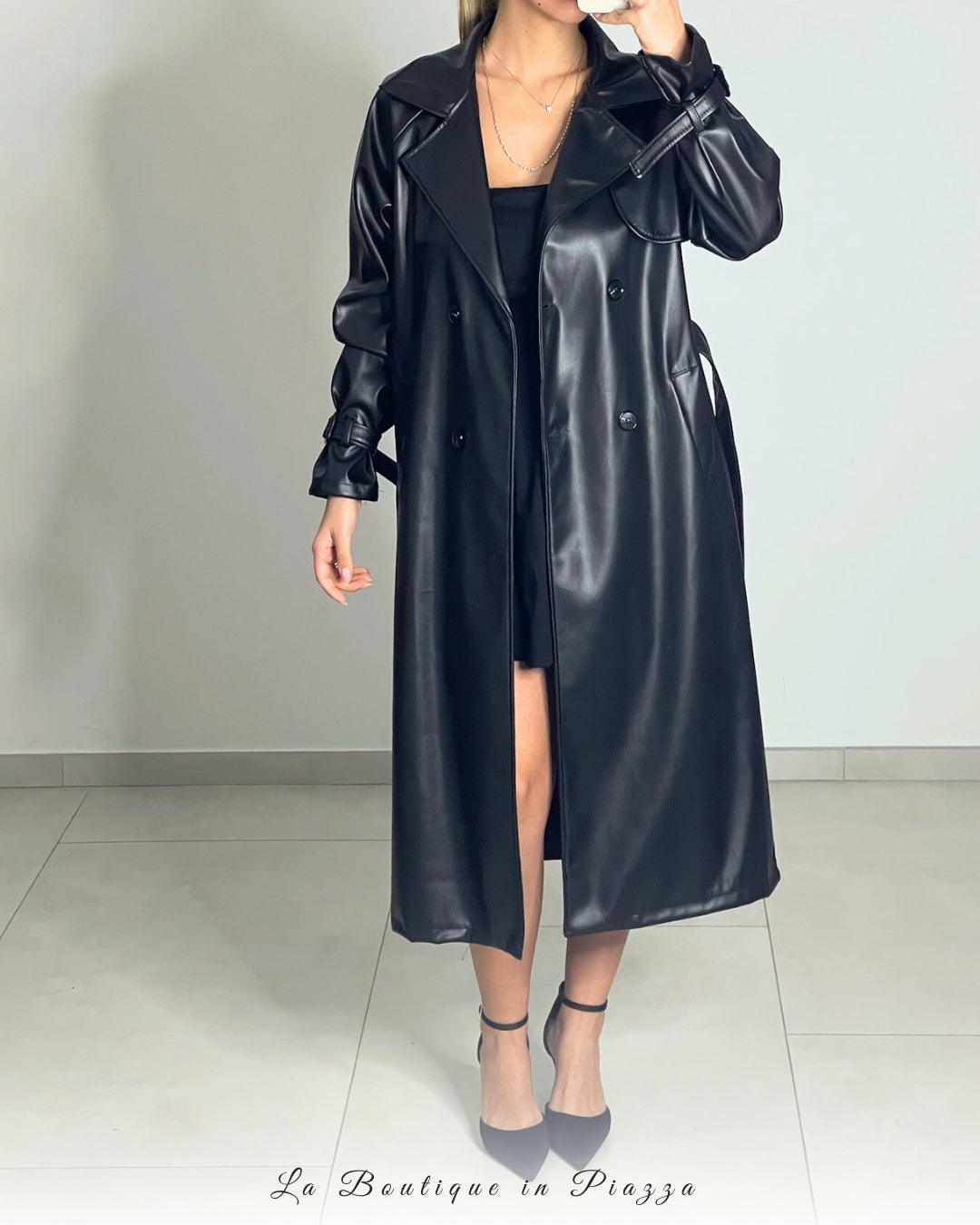 Trench lungo in ecopelle con doppio petto e dettagli classici.