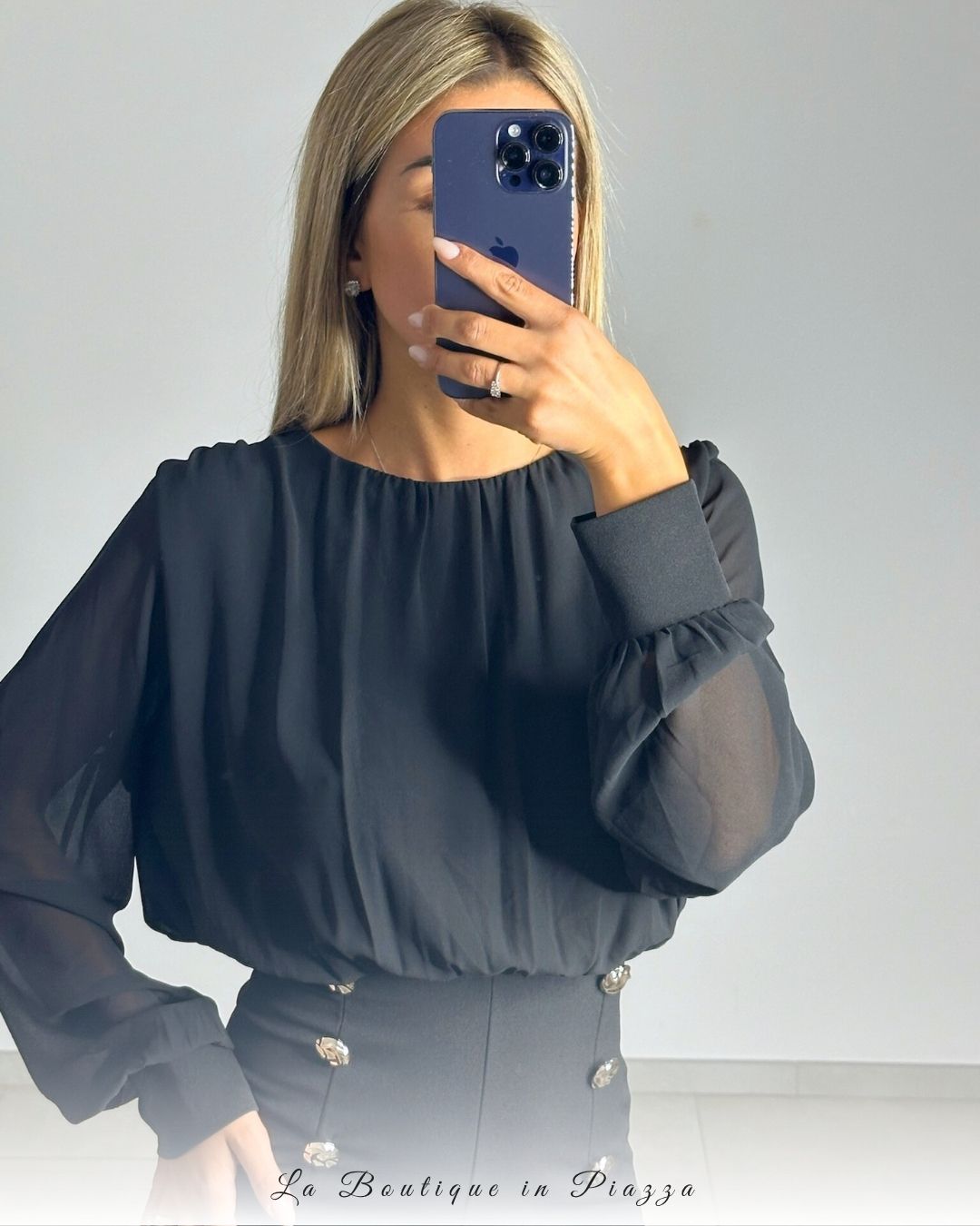 Parte superiore in chiffon con maniche a sbuffo e parte inferiore a zampa. Bottoni dorati doppiopetto per un look regale.